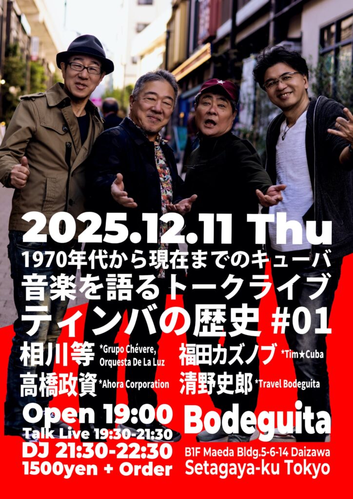ミュージシャン、DJ・ダンサー、レコード会社、キューバ旅行会社からの目線で、ティンバの歴史とその魅力を明らかにする待望のトークライブ・シリーズがスタート!以前、チェベレの相川等さんと行っていた「トーク・ティンクーバ」の発展系ですが、単発ではなく毎月開催とし、様々な視点でティンバの魅力を明ら..