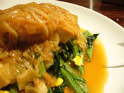 ドーンとメイン登場。 鳥のもも肉はふっくら! つけあわせはたっぷりのお野菜ですが ホウレン草、コーン、あとはサトイモ? と 思っていたら、えび芋でしたー。やるな。