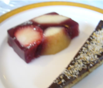 桃と赤ワインのテリーヌなどのデセールと共にそれは