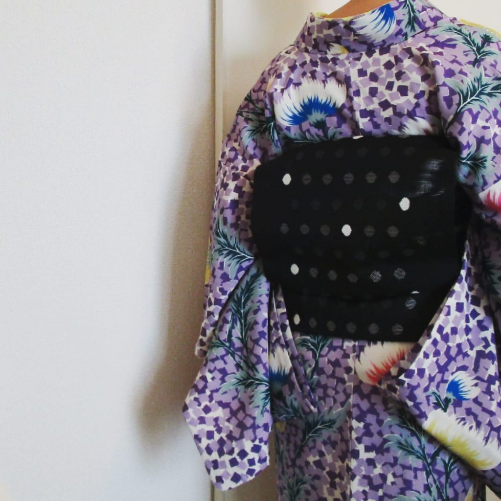 薊の着物に黒の夏帯で。